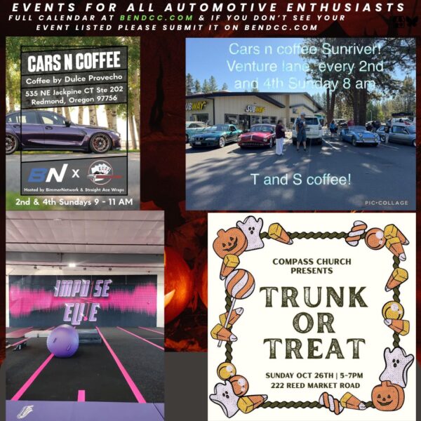 10/25 - Trunk or Treat at Impulse Elite 5:00pm 10/26 - Trunk or Treat at Compass Church 5:00pm 10/26 – Cars & Coffee Sunriver at 8:00am 10/26 – Central Oregon Cars & Coffee at 9:00am Presented by BimmerNetwork & Straight ace wraps! Full event & address information can be found...