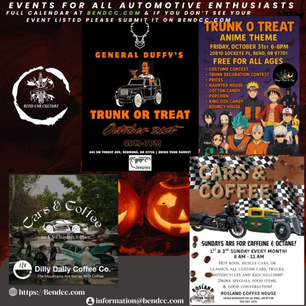 10/31 - General Duffy's Trunk or Treat 4:00pm to 7:00pm Redmond 10/31 - Trunk O Treat at Royal Tint N Dip 6:00pm to 8:00pm Bend 11/2 - Bend Cars & Coffee Dilly Dally Coffee Co 8:00am 11/2 - Rosland Cars & Coffee 8:00am Have a fun and safe Halloween. Full...