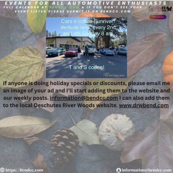 11/9 - Cars & Coffee Sunriver at 8:00am If anyone is doing holiday specials or discounts, please email me an image of your ad and I’ll start adding them to the website and our weekly posts. information@bendcc.com I can also add them to the local Deschutes River Woods website. www.drwbend.com