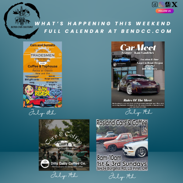Hope all is enjoying this great weekend. Please spread the word about the events... July 6th - Cars and Sunsets Hosted by Tradesmen Coffee & Taphouse 3pm - 6pm July 7th - Car Meet with Kam Vandehey 7pm July 7th - Bend Cars & Coffee Hosted by Dilly Dally Coffee...