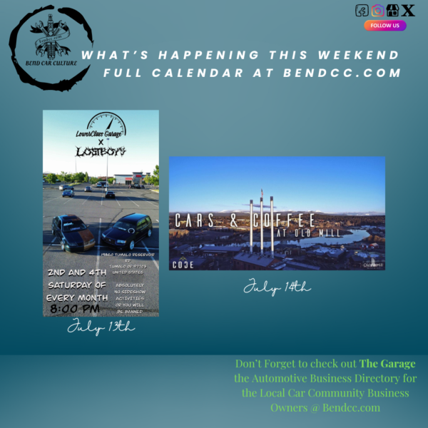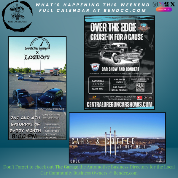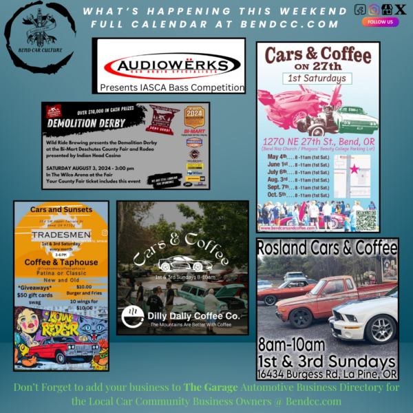 This week’s flyer brought to you by Bend Custom Check them out on Facebook, Instagram & BendCustom.com August 3rd - Audiowerks presents IASCA Bass Competition August 3rd - Cars & Coffee on 27th August 3rd - Demolition Derby Deschutes County Fair and Rodeo August 3rd - Cars and Sunsets Hosted by Tradesmen...