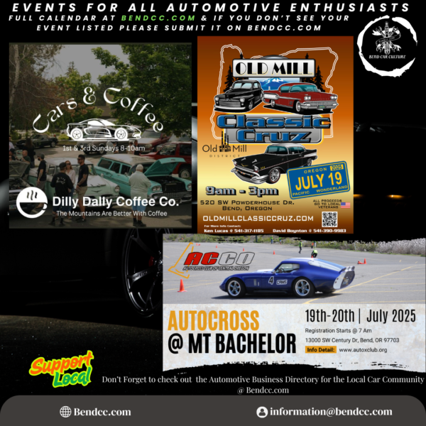 July 19th & 20th - ACCO – Mt. Bachelor Ski Resort July 19th - 1st Annual Old Mill Classic Car Show at 9:00am July 20th - Bend Cars & Coffee hosted by Dilly Dally Coffee Co at 8:00am Car Shows Coming UP 41st Annual Oregon High Desert Swap Meet 9/6/25...