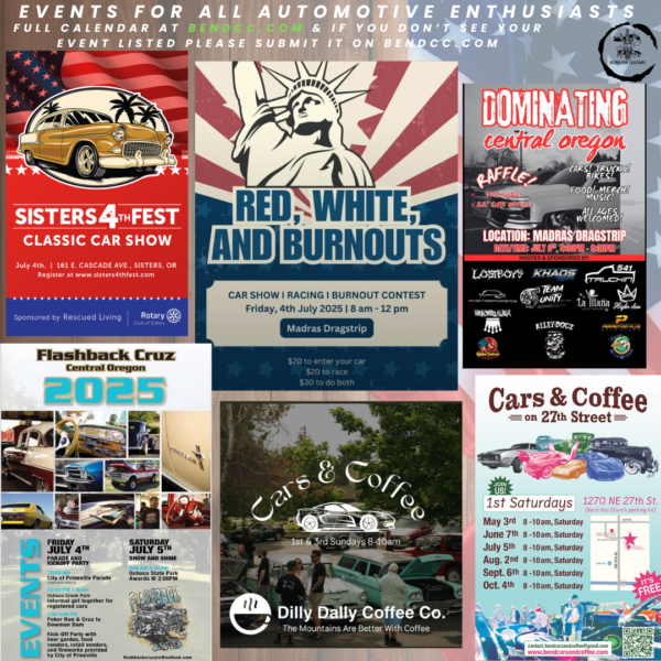 7/4 - Sisters 4th Fest Hosted by Rotary Club of Sisters at 7:00am 7/4 - Red White & Burnouts hosted by Madras Dragstrip at 8:00am 7/5 - Cars & Coffee on 27th Street at 8:00am 7/5 - Central Oregon Flashback Car Show 2025 at 9:00am 7/6 - Dominating Central Oregon...