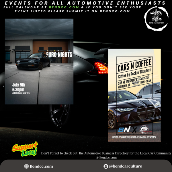 7/9 - Bend EURO Nights Hosted by NW Wheel & Tire @ 6:30pm 7/13 - Central Oregon Cars N Coffee 9:00am Presented by BimmerNetwork & Straight ace wraps! Car Shows Coming UP 1st Annual Old Mill Classic Car Show 7/19/25 41st Annual Oregon High Desert Swap Meet 9/6/25 Glory Daze...