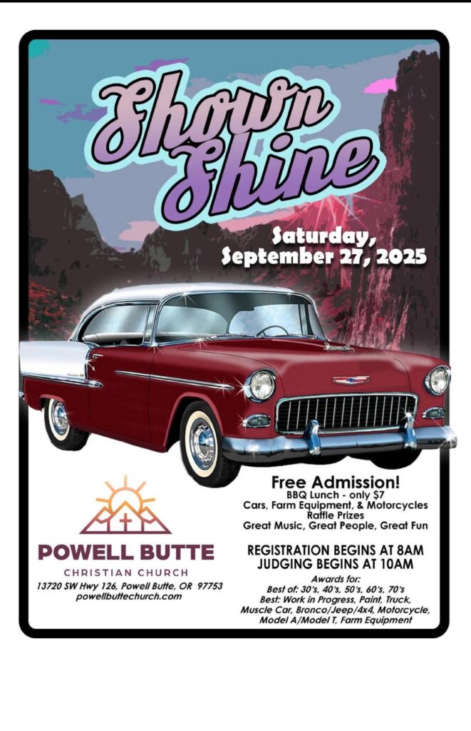 Gates opens and registration begins at 8:00 a.m. at Powell Butte Christian Community Church car show this Saturday, September 27th.