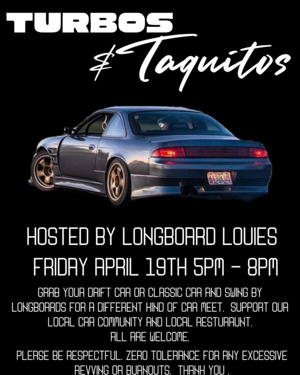Come join at longboard_louies for our first ever Turbos & Taquitos on Friday, April 19th! Grab some food and enjoy the car culture Bend has to offer. Hope to see you there!