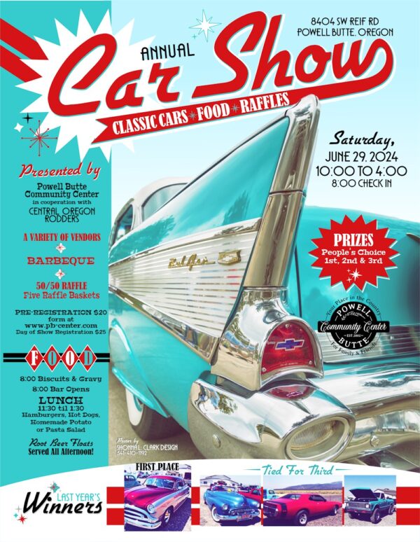 Annual Car Show June 29th, 2024 8:00am Check In Food, Raffel, BBQ Prizes People's Choice 1st, 2nd, & 3rd Pre-Registration $20 Day of Show $25