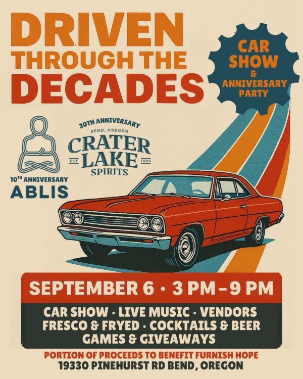 Celebrating 30 years of Crater Lake Spirits + 10 years of Ablis with one huge party — Driven Through the Decades Car Show and Anniversary Party! Join us Saturday, Sept. 6th at Bendistillery for: Live music all evening Tacos from Fresco & Fryed Full-sized cocktails, beer & N/A beverages Local...