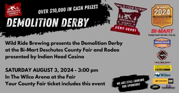 Wild Ride Brewing presents Demolition Derby at the Bi-Mart Deschutes County Fair and Rodeo presented by Indian Head Casino SATURDAY AUGUST 3, 2024 - starts at 3:00 pm in the Wilco Arena. Your County Fair ticket includes this event! Rev your engines... and let the chaos begin! Indulge in a...